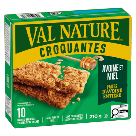 Flocons d'avoine entière, Sucres (sucre et [ou] sucre doré, sirop doré, miel), Huile de canola riche en gras monoinsaturés, huile de canola et (ou) huile de tournesol riche en gras monoinsaturés, Farine de riz, Sel, Bicarbonate de sodium, Lécithine de soya, Arôme naturel.