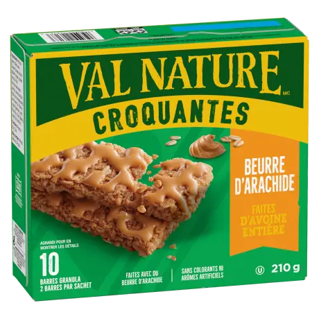 Les barres granola Val Nature* Beurre d'arachide combinent des flocons d'avoine entière, du riz croustillant et du beurre d'arachide crémeux pour vous offrir une collation sucrée et saine.