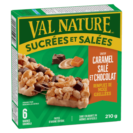 Les barres granola Val NatureMC Sucrées et salées Caramel salé et chocolat offrent le parfait mélange de noix salées et de granola sucré. Chaque barre déborde d’arachides entières grillées et de délicieux morceaux de chocolat.
