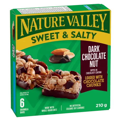 Nature Valley Sweet & Salty Dark Chocolate Nut Granola Bars are a delicious balance of chewy granola, peanuts, and almonds, bursting with dark chocolate chunks, dipped in a creamy nut butter coating. It’s chocolate, the Nature Valley way.