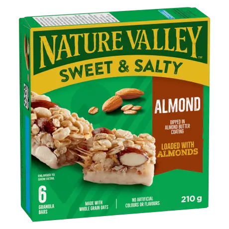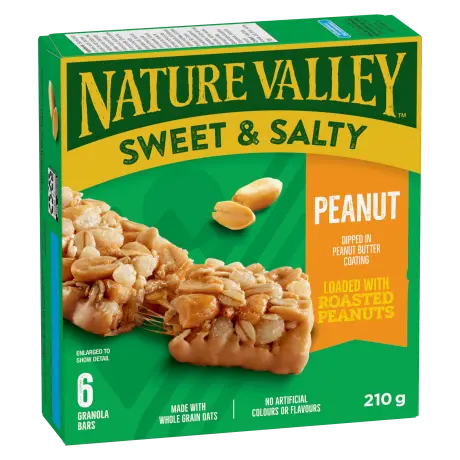 Nature Valley Sweet & Salty Peanut Granola Bars offer a perfect balance of savoury nuts and sweet granola. Each bar is bursting with whole roasted peanuts and dipped in a creamy nut-butter coating.
