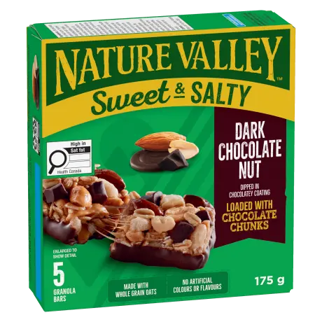 Whole grain rolled oats, Milk chocolate (sugar, cocoa butter, chocolate liquor, modified milk ingredients, soy lecithin, salt, natural flavour), Fructooligosaccharides (inulin fibre), Sugars (sugar, maltose, maltodextrin, invert sugar, fancy molasses, honey), Brown rice flour, White chocolate chunks (sugar, cocoa butter, whole milk powder, soy lecithin, natural flavour), Glycerin, Chicory root extract, High monounsaturated canola oil, Enriched wheat flour, Soy lecithin, Natural flavour, Graham flour, Canola oil, Salt, Baking soda, Calcium carbonate, Baking powder.